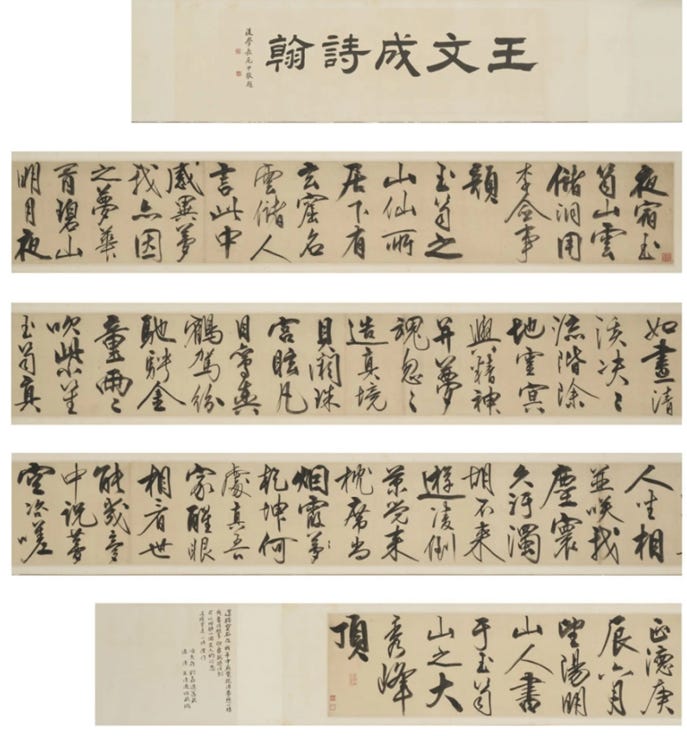 2025年拍卖的《王文成公诗翰》,是王阳明流传至今的稀世墨迹,为我们呈现了其晚年思想与艺术实践的高度融合。此卷为手卷式样(手卷),须横向展卷,逐段赏读。全卷作于正德庚辰年六月十五日,即1520年夏,彼时王阳明年约四十八,正值其平定宁王叛乱凯旋之后,亦为其心学思想成熟之际。根据王阳明自题,此卷写于江西玉笥山大秀峰顶。
