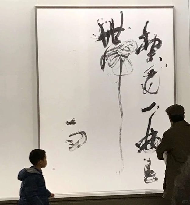 然而,若从古典主义的严苛立场出发,这幅作品在“意”与“文”之间更倾向于图像象征。个别汉字的构形被视觉意图所吞没,几近难辨。这种做法,自“具体派”(Gutai)以来,长期受到日本前卫艺术的肯定,却往往遭遇中国传统书法语境中的保守质疑。