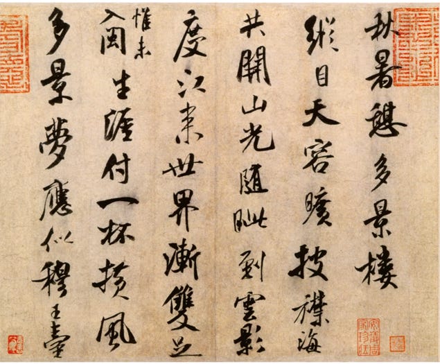 《秋暑憩多景楼帖》被一些人视为米芾的“行书代表作”。介绍常写得很笃定:北宋元丰九年(1086年),米芾登临镇江多景楼,兴起挥毫,诗书合璧,真迹今藏故宫。配上这几张放大的局部,观者自然会把它当成“标准米字”来临摹。