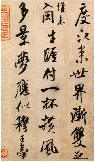 米芾之所以被后人疯狂迷恋,很大一部分原因在于他的“失态”。他写字常常“不怕丑”,笔画经常超出常规,字形也会突然放大、突然扭斜。正因为这半步失态,才显出一种近乎任性的生命力。