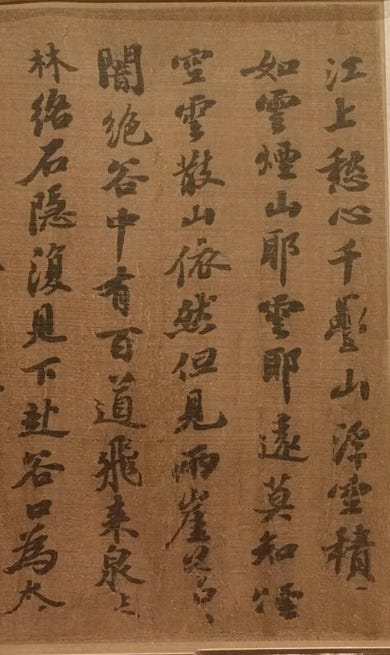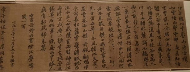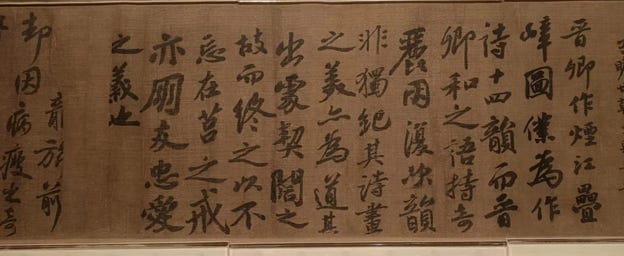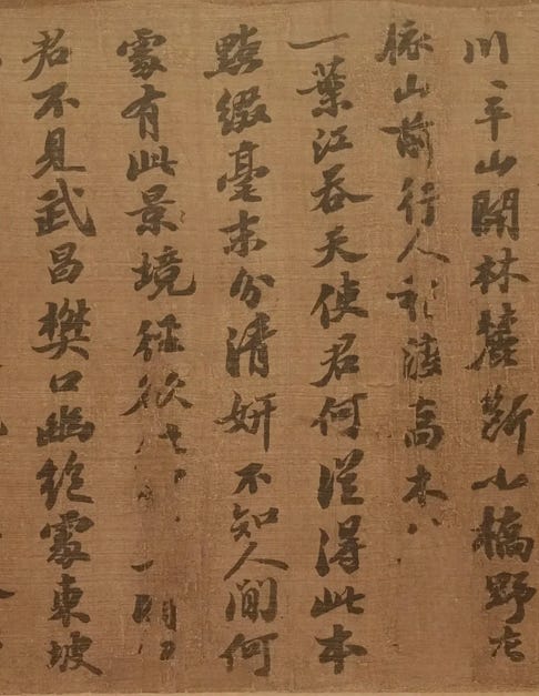 在博物馆昏黄而相对均匀的顶光下,《烟江叠嶂图》长卷的题跋部分随墨色的浓枯起伏,显现出一种并不常见的“漆黑”效果:线条肥硕而黯实,墨韵厚重而缺乏层次,沉着地铺陈在褐色熟绢之上。这种视觉第一印象,已经与我们熟悉的苏轼真迹之间拉开了距离。苏轼的行草向来以酣畅淋漓、枯湿相生见长,即使同一笔内也常有“浓似漆、淡如烟”的丰富变化;而眼前这件作品的墨色却近乎单调地“满含水分”,在笔锋提按之间鲜少出现有机的枯笔与飞白。单从墨韵判断,此卷更像明清人惯用的“复墨”写法,而非北宋书家在多浆雁毫中自然取得的苍润之气,这一差别在彰显时代风格的同时,也暗示了后世重写或摹刻的可能。