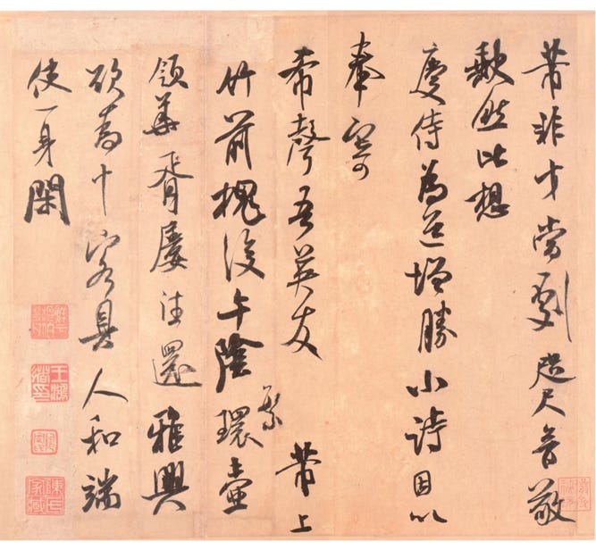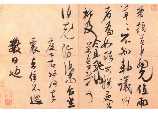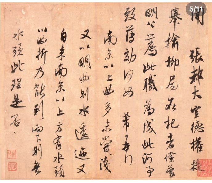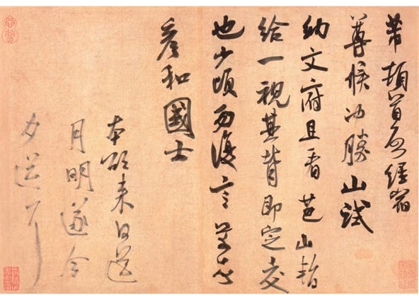 也许有人会问:有些页看上去“草率甚至粗糙”,是否降低了艺术性?在书信体里,我恰恰愿意为这种“粗粝”辩护。古人“书乃生活”,信札写作不是为悬诸庙堂,而是为一时一事;粗粝处,反倒是“当下的温度”。宋人崇尚写意,真正的“写意”,并不在于刻意留白与章法新巧,而在于“意到笔随”。米芾尺牍的粗粝,往往伴随着“判断的果决、情绪的起伏”——就像他谈价、谢柑、忆游、寄情,每一次快下,都在纸上留下了“决定”的形迹。这份“真实”,正是尺牍与“正规书写”最大的差别与价值。
