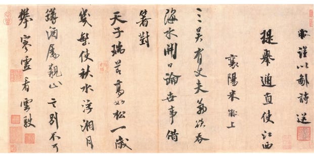 米芾的尺牍,向来被看作理解他书风“真面目”的钥匙。展卷台北故宫所藏这册“米芾尺牍(共十一页)”,最先扑面而来的不是“名帖”的矜持,而是一个鲜活的宋人:他一会儿为友人采办书画、一会儿谈丹阳米价、又忽然写起即景小诗;笔下忽疾忽徐、行中忽宽忽束,信手拈来皆成章。这种贴近生活的自然书写,与他在《蜀素帖》那种“为人所观”的整饬气象形成清晰对照,也正应了米芾自称“臣书刷字”的那句名言——以快锋入纸、以疾势纵横,贵在神情的勃发而不在姿态的雕饰。