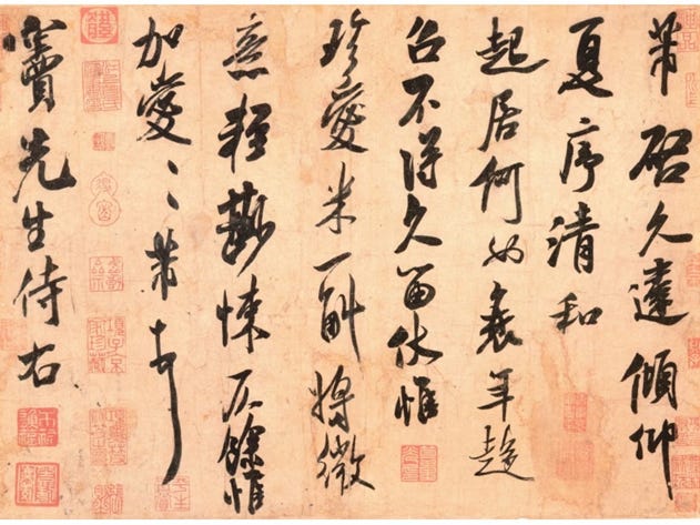 从审美史看,尺牍恰好证成了宋人“以书写性为尚”的理想。北宋的书学自觉,不再仅以法度为终点,而更强调“性情与自我”的出场。米芾在生平、癖好与论书中,屡屡申言“贵自然”“重兴会”,对“雕词奇句”的评书之风不以为然;他把“书”还原为“写”,把“法”落实在“行笔与布白的当下选择”。这份理念,透过尺牍的快慢、枯润、欹正,给了我们“观看一位书家如何处理生活”的机会,也让我们明白:他为什么自许“刷字”——不是炫技,而是把速度当作情感与判断的工具。